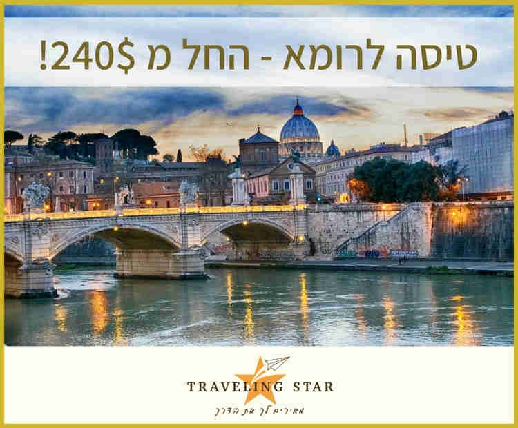 ההזדמנויות המצליחות לא מפסיקות להפתיע! טיסה לרומא כולל מזוודה החל מ-240$! סופ"ש ארוך של 4 ימים בתחילת פברואר. שזה ממש אוטוטו. כל הדרכים מובילות לרומא! והדרך שלנו מתוקה מתמיד. וכדי לחסוך לכם זמן מבוזבז, לרוכשים נשלח במייל מדריך נהדר ומקיף (כולל המלצה למסעדה שתרצו לעבור לגור במטבח שלה) כדי שתמצו כל רגע בעיר הרומנטית המדליקה והנפלאה הזאת! לשבת בבר קטן חבוי באחת הסמטאות הציוריות ולשתות יין מקומי טוב, salute! אחת מערי הבירה היפות והמרתקות בעולם, שהיוותה השראה לאמנים רבים וצולמו בה סרטי קולנוע, בה תוכלו לראות יצירות מדהימות בתחום הארכיטקטורה והאמנות, מזרקות יפיפיות מקושטות פסלים, רחובות שתחלמו עליהם הרבה זמן אחרי שתחזרו לארץ, שפה מקסימה ומוזיקלית שתמיד מעוררת תאבון לפיצה טובה, שוקולטה או אהבת אמת (רגע, גם פיצה ושוקולטה הן אהבות אמת!), מוזיאונים, חנויות, מופעי רחוב, ציירים, גשרים הומי תמונות סלפי, הקולוסיאום, כיכרות רחבות וקסומות, ואולי אפילו תקפצו לבקר בותיקן. קל להתנייד במטרו/מונית אבל הכי נחמד לחרוש את העיר רגלית. ואל תשכחו לבקש בגלידרייה : "Vorrei un gelato con due gusti per favore" זה אומר שאתם מבקשים שני טעמים. נראה לכם שאפשר לעצור באחד?